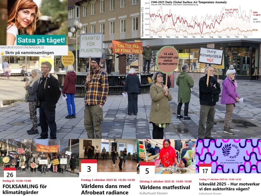 2025-09-25 FOLKSAMLING på Renmarkstorget 26/9, Världens dans 3/10, Världens matfestival 5/10, Ickevåld 2025 17/10, Satsa på tåget, +1.79 °C![]() ⭐ FOLKSAMLING för Klimatåtgärder 26/9 kl 12:00 - 13:00 på Renmarkstorget - SistaFredagsPepp - Vi fortsätter kampen för klimatåtgärder och behöver synas mer på gator och torg! - Vi försöker få med extra mycket folk sista fredagen varje månad. Kom så lång tid du vill under denna timme! Försök få med någon ny som inte brukar komma, kanske en vän, granne eller bekant! - www.facebook.com/events/124369... ⭐ Världens dans med Afrobeat radiance - Fredag 3 oktober 2025 kl 13:30-14:30 - Seniortorget, Renmarkstorget 15 Umeå - www.facebook.com/events/198118... ⭐ Världens matfestival - Söndag 5 oktober 2025 kl 14-16 - Kulturhuset Klossen - www.facebook.com/events/214778... ⭐ Ickevåld 2025 - Hur motverkar vi den auktoritära vågen? - Fredag 17 oktober 2025 kl. 13:00-16:30 - Kulturhuset Klossen - www.facebook.com/events/180899... ⭐ Satsa på tåget - Namninsamling - Naturskyddsföreningen - www.naturskyddsforeningen.se/k... + 1.79 °C (19 sep) - Daily Global Surface Air Temperature Anomaly - jmadden.org/pr-anomaly.html Nyhetstips: ⬦ Succé i kyrkovalet för Umeåparti – vill stoppa kalhyggen - P4 Västerbotten | Sveriges Radio - www.sverigesradio.se/artikel/s... ⬦ Efter Northvolt: Batterifabriken kan få militärt fokus - P4 Västerbotten | Sveriges Radio - www.sverigesradio.se/artikel/e... ⬦ Så återskapar vi demokratin underifrån - Rörelsen - www.tidningenrorelsen.se/p/sa-... ⬦ Vems intressen tjänar våra makthavare? Johannes Klenell om lobbyismen som undergräver demokratin - Verbal Media (58:12 2025-09-24) - ![]() ⬦ Upprop: När aktivister demoniseras förlorar hela demokratin - Supermiljöbloggen - supermiljobloggen.se/debatt/up... ⬦ Italien skickar örlogsfartyg till Gazakonvoj - Ekot | Sveriges Radio - www.sverigesradio.se/artikel/a... ⬦ Hur en liten grupp fick våtmarker högst på agendan - Syre - tidningensyre.se/2025/06-septe... ⬦ Så skadesköt centerpartister kyrkans skogsutredning - Supermiljöbloggen - supermiljobloggen.se/nyheter/s... ⬦ Efter katastrofsommaren: Spanien tar strid mot klimatförnekarna - Klimatgranskaren - klimatgranskaren.se/efter-kata... På engelska: (textning och översättning [maskin-] kan aktiveras via kugghjulssymbolen på YouTube) ⬦ Super Typhoon Ragasa: at least 14 killed in Taiwan after barrier lake burst - Guardian News (1:08 2025-09-24) - ![]() ⬦ What the Hell is Going On in the North Pacific? - Climate Chat (0:00 2025-09-20) - ![]() ⬦ Why is Arctic Sea Ice Melt SLOWING DOWN?? - Just Have a Think (12:36 2025-09-21) - ![]() War, Economy & Geopolitics: ⬦ Why Civilizations Fall and What We Can Learn From It with Luke Kemp | TGS 194 - Nate Hagens (2:15:26 2025-09-24) - ![]() ⬦ MOST POWERFUL SPEECH: Indonesia's President UNGA Ultimatum: The World Must Stop the War in Gâza. - The Africa News Network (16:52 2025-09-24) - ![]() ⬦ Paul Jay: How 80 Years of Lies and Profiteering Built the Doomsday Machine - theAnalysis-news (50:02 2025-09-19) - ![]() ⭐ Fler nyhetstips i NYHETSBANKEN! www.okej.nu/nyhetsbank Hälsningar Jens 0702927599 Om du är trött på Aktuellt, Rapport, TV4-Nyheter etc - hoppa över dem några dar i veckan och kolla istället nyheter med mer konstruktiva perspektiv från min NYHETSBANK med YouTube-spelare som fylls på löpande! Eller kör denna SPELLISTA MED YOUTUBE-VIDEOS FRÅN VECKAS NYHETSTIPS: SPELLISTA 2025-09-25 (7 Videos) 356