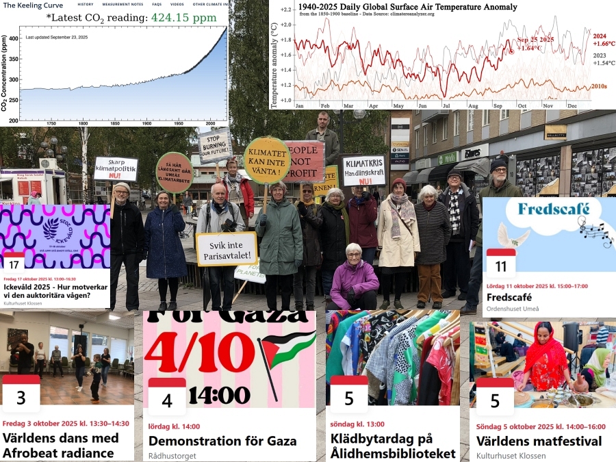 2025-10-01 Fredagsmanifestation vid Rådhustorget 3/10, Världens dans 3/10, Gaza-demo 4/10, Klädbytardag 5/10, Världens matfestival 5/10, Fredscafé 11/10, Ickevåld 2025 17/10, 424 ppm, +1.79 °C![]() ⭐ PeopleForFuture Umeå är på Rådhustorget fredag kl 12:00 - 13:30, med banderoll, namninsamling, flygblad etc. Alla är välkomna! Vi vill bli fler för att öka opinionstrycket på politiker, kom en stund om du har möjlighet! ⭐ Världens dans med Afrobeat radiance - Fredag 3 oktober 2025 kl 13:30-14:30 - Seniortorget, Renmarkstorget 15 Umeå - www.facebook.com/events/198118... ⭐ Demonstration för Gaza - lördag 4/10 kl 14:00 - Rådhustorget - www.facebook.com/events/116029... ⭐ Klädbytardag på Ålidhemsbiblioteket - söndag 5/10 kl 13:00 - www.facebook.com/events/658095... ⭐ Världens matfestival - Söndag 5 oktober 2025 kl 14-16 - Kulturhuset Klossen - www.facebook.com/events/214778... ⭐ Fredscafé - Lördag 11 oktober 2025 kl 15-17 - Popup-utställning med bilder från tecknaruppropets "Nato på allas läppar" + musik och tal - Ordenshuset Umeå ⭐ Ickevåld 2025 - Hur motverkar vi den auktoritära vågen? - Fredag 17 oktober 2025 kl. 13:00-16:30 - Kulturhuset Klossen - www.facebook.com/events/180899... ⭐ Latest C02 reading: 424.15 ppm - keelingcurve.ucsd.edu/ + 1.64 °C (25 sep) - Daily Global Surface Air Temperature Anomaly - jmadden.org/pr-anomaly.html Nyhetstips: ⬦ Insändare: Tillåt elbilar att köra förbi avstängningarna väst-på-stan - www.vk.se/2025-09-29/insandare... ⬦ Hajar och rockor ser ut att leva runt vindkraftverk till havs | illvet.se - illvet.se/naturen/forskare-gor... ⬦ Trump kan göra Wallenbergs riskkapital störst i världen | Dagens ETC - www.etc.se/ledare/trump-kan-go... ⬦ Ditt livs sämsta affär: En ny bensin- eller dieselbil - Supermiljöbloggen - supermiljobloggen.se/debatt/kr... ⬦ Timbro och Oikos är ett vackert par | Dagens Arena - www.dagensarena.se/opinion/tim... ⬦ Sven-Eric Liedman om politikens brist på vilja och visioner - DN.se - www.dn.se/kultur/sven-eric-lie... På engelska: (textning och översättning [maskin-] kan aktiveras via kugghjulssymbolen på YouTube) ⬦ What we know about Atmospheric Rivers: the latest peer-reviewed science… - Paul Beckwith (48:31 2025-09-29) - ![]() ⬦ +3ºC by 2050?! - Climate Chat (1:27:00 2025-09-28) - ![]() ⬦ The INSANE Carbon Capture SCAM continues. - Just Have a Think (14:40 2025-09-28) - ![]() ⬦ Are climate scientists the wrong kind of conservative? - Climate Chat (3:04 2025-09-29) - ![]() ⬦ Taxation for Fair Climate Financing - oxfaminternational (1:21:54 2025-09-27) - ![]() ⬦ Devastation in Pakistan - Inside the Monsoon Floods - Climate Emergency Forum (29:56 2025-09-28) - ![]() War, Economy & Geopolitics: ⬦ Why Humanity Is Better Than We Think | Frankly 108 - Nate Hagens (22:06 2025-09-26) - ![]() ⬦ Jeffrey Sachs: NATO Warmongers & the World on the Edge of War - Glenn Diesen (33:54 2025-09-27) - ![]() ⬦ Netanyahu's billionaire buddies buy up US media - The Grayzone (8:13 2025-09-26) - ![]() ⬦ Patrik Baab: Europe Prepares the Public for War with Russia - Glenn Diesen (40:29 2025-09-28) - ![]() ⬦ You’re an IDIOT if you think of the economy like this: Top Economist - ProfSteveKeen (10:46 2025-09-28) - ![]() ⬦ Episode 716 Persistent Fact-checking - ToSaveTheWorld (1:01:22 2025-09-28) - ![]() ⭐ Fler nyhetstips i NYHETSBANKEN! www.okej.nu/nyhetsbank Hälsningar Jens 0702927599 Om du är trött på Aktuellt, Rapport, TV4-Nyheter etc - hoppa över dem några dar i veckan och kolla istället nyheter med mer konstruktiva perspektiv från min NYHETSBANK med YouTube-spelare som fylls på löpande! Eller kör denna SPELLISTA MED YOUTUBE-VIDEOS FRÅN VECKAS NYHETSTIPS: SPELLISTA 2025-10-01 (12 Videos) 357