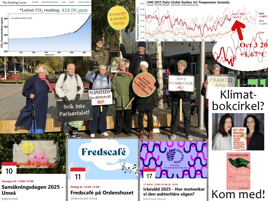2025-10-09 Fredagsmanifestation vid Rådhustorget 10/10, Samåkningsdagen 10/10, Fredscafé 11/10, Ickevåld 17-18/10, Klimatbokcirkel, 424 ppm, +1.67 °C![]() ⭐ PeopleForFuture Umeå är på Rådhustorget fredag kl 12:00 - 13:30, med banderoll, namninsamling, flygblad etc. Alla är välkomna! Vi vill bli fler för att öka opinionstrycket på politiker, kom en stund om du har möjlighet! ⭐ Den 10 oktober firar vi Samåkningsdagen i Umeå! Samåkningsdagen är en årligen återkommande dag. I år bjuder den ideella samåkningsrörelsen Skjutsgruppen i samarbete med Umeå Kommun in till fika och information på Kajen i Umeå kl 14-15. Läs mer: www.facebook.com/events/114881... ⭐ Fredscafé på Ordenshuset - Lördag 11 oktober 2025 kl 15-17 - Broparkens Spelmadammer, Fika till försäljning! Satirteckningar visas ur utställningen "Nato på allas läppar” - Tecknaruppropet mot kärnvapen. - Levande Musik, Sång, Poesi, Boktips, Inspiration, Gemenskap och Fika - Ordenshuset Umeå - www.facebook.com/events/798828... ⭐ Ickevåld 2025 Del 1: Autokratisering i Sápmi? Hotbild och motstånd: Fredag 17 oktober kl 13-15.30, Tráhppie | Del 2: Först drabbade, sist hörda: Fredag kl 18-20, Västerbottens museum | Del 3: Hur motverkar vi den auktoritära vågen?: Lördag 18 okt kl. 8:30-16:30 - Kulturhuset Klossen - www.facebook.com/events/180899... ⭐ Klimatbokcirkel - Kom med! - Missa inte att få läsa dessa fantastiska böcker tillsammans med andra! "Norgeparadoxen : en granskning av det goda landets svarta baksida" av Lisa Röstlund och "Att låta världen få veta : handbok i klimatjournalistik" av Lisa Röstlund och Alexandra Urisman Otto. Vi startar upp nya cirklar med dessa böcker, dagtid eller kvällstid - kontakta Jens på 0702927599 om du vill vara med! ⭐ Latest C02 reading: 424.06 ppm - keelingcurve.ucsd.edu/ + 1.67 °C (3 okt) - Daily Global Surface Air Temperature Anomaly - jmadden.org/pr-anomaly.html Nyhetstips: ⬦ Replik: För boendemiljöns skull – därför reglerar vi trafiken Väst på stan - www.vk.se/2025-10-06/replik-fo... ⬦ Ditt livs sämsta affär: En ny bensin- eller dieselbil - Supermiljöbloggen - supermiljobloggen.se/debatt/kr... ⬦ Greta Thunberg gjorde det Sverige inte vågade | Dagens Arena - www.dagensarena.se/opinion/de-... ⬦ EU-kommissionen tar Sverige till EU-domstolen – lever inte upp till klimatåtaganden - www.aftonbladet.se/nyheter/a/A... ⬦ Sven-Eric Liedman om politikens brist på vilja och visioner - DN.se - www.dn.se/kultur/sven-eric-lie... ⬦ Trump kan göra Wallenbergs riskkapital störst i världen | Dagens ETC - www.etc.se/ledare/trump-kan-go... ⬦ Stormen Amy: En död på Irland | SVT Nyheter - www.svt.se/nyheter/utrikes/gar... ⬦ Rapport: Klimatsmart mat kan rädda 15 miljoner liv - Ekot | Sveriges Radio - www.sverigesradio.se/artikel/r... ⬦ Timbro och Oikos är ett vackert par | Dagens Arena - www.dagensarena.se/opinion/tim... ⬦ Pourmokhtari har bara populismen kvar - Klimatgranskaren - klimatgranskaren.se/pourmokhta... ⬦ Maria Wolodarski om Hälso- och sjukvårdens roll och ansvar i klimatomställningen - Researchers Desk (32:55 2025-10-03) - ![]() På engelska: (textning och översättning [maskin-] kan aktiveras via kugghjulssymbolen på YouTube) ⬦ Burned by Billionaires, with Chuck Collins - Post Carbon Institute (44:46 2025-10-08) - ![]() ⬦ Global Warming Changes to the Pacific Oceans “Gulf Stream Equivalent” known as the Kuroshio Current - Paul Beckwith (26:12 2025-10-03) - ![]() ⬦ Coral Reefs - The Ocean's Rain Forests in Decline - Climate Emergency Forum (26:06 2025-10-05) - ![]() ⬦ Bitcoin Mining Energy Consumption Myth Busted: How It Powers Renewable Grids - Sustainability Illustrated (11:33 2025-10-02) - ![]() ⬦ Decarbonizing the Planet: China Leads the Way Out of the Climate Crisis - BreakThrough News (42:02 2025-09-30) - ![]() ⬦ “Termination Shock” Could Explain Recent Global Warming, Some Climate Scientists Think - Sabine Hossenfelder (8:00 2025-09-30) - ![]() ⬦ Tipping points, conservative models and will climate shocks cause people to rise up? | NFAWIF | XRUK - Extinction Rebellion (XR) UK (38:15 2025-09-30) - ![]() War, Economy & Geopolitics: ⬦ Netanyahu PLAYED Trump Like The Idiot He Is | The Kyle Kulinski Show - Secular Talk (16:13 2025-10-07) - ![]() ⬦ History Repeats Itself: First as Tragedy, Then as Trump - Peter Kuznick Pt. 1/2 - theAnalysis-news (30:53 2025-10-07) - ![]() ⬦ Deep Listening: Understanding Those We Disagree With - The Conduit (1:19:44 2025-10-09) - ![]() ⬦ The Deep Roots of Inequalities - European Network on Debt and Development (5:33 2025-10-08) - ![]() ⬦ Blackrock CAUGHT In MASSIVE Criminal Scheme You Have To See To Believe | The Kyle Kulinski Show - Secular Talk (15:10 2025-10-07) - ![]() ⬦ Trump's Gaza Plan Is Mere "Repackaging of Genocide" for Israel's Benefit: Diana Buttu - Democracy Now! (10:11 2025-09-30) - ![]() ⬦ NYT Report: US & Venezuela Opposition Plotting Regime Change. US In Full War Preparation. - Neutrality Studies (24:12 2025-09-30) - ![]() ⭐ Fler nyhetstips i NYHETSBANKEN! www.okej.nu/nyhetsbank Hälsningar Jens 0702927599 Om du är trött på Aktuellt, Rapport, TV4-Nyheter etc - hoppa över dem några dar i veckan och kolla istället nyheter med mer konstruktiva perspektiv från min NYHETSBANK med YouTube-spelare som fylls på löpande! Eller kör denna SPELLISTA MED YOUTUBE-VIDEOS FRÅN VECKAS NYHETSTIPS: SPELLISTA 2025-10-09 (15 Videos) 358