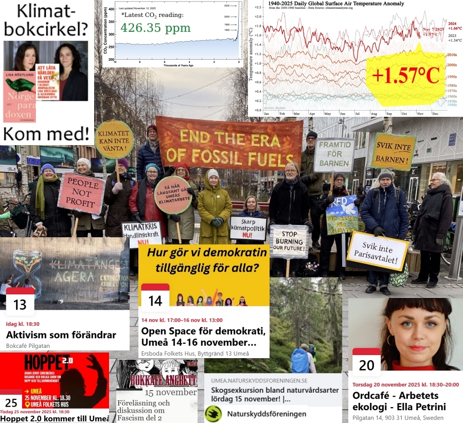 2025-11-13 Fredagsmanifestation 14/11, Aktivism 13/11, Open Space 14-16/11, Angbett 15/11, Skogsexkursion 15/11, Ella Petrini 20/11, Hoppet 2.0 25/11, Klimatbokcirkel, 426 ppm, +1.57 °C