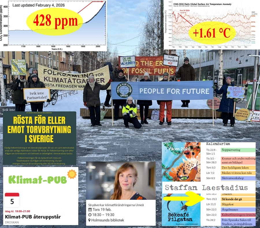 2026-02-05 Fredagsmanifestation 23/1, Klimat-PUB 5/2, Så påverkar klimat... Katharina Radloff 19/2 mfl, Staffan Laestadius 19/2, Olydig Folkomröstning, 428 ppm, +1.61 °C