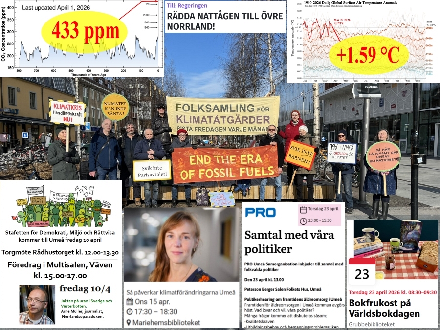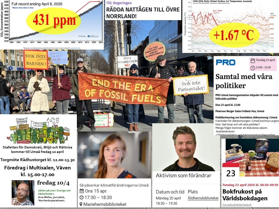 2026-04-09 Fredagsmanifestation för klimatet 10/4, SOL-nätverket och Arne Müller 10/4, Så påverkar klimat... Katharina Radloff 15/4, Johan Örestig 20/4, Världsbokdagen 23/4, PRO Politikerhearing 23/4, Rädda Nattågen, 431 ppm, +1.67 °C
