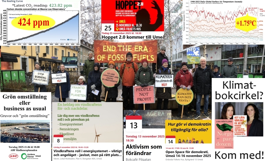 2025-11-06 Fredagsmanifestation 7/11, Grön omst 6/11, Diskutera vindkraft 8/11, Aktivism 13/11, Hoppet 2.0 25/11, Klimatbokcirkel, 424 ppm, +1.75 °C