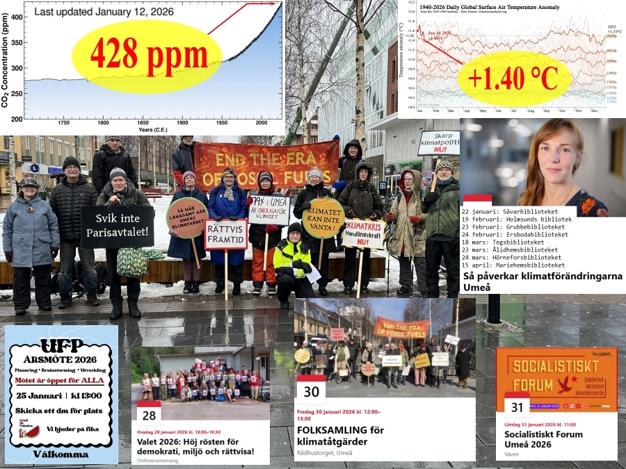 2026-01-22 Fredagsmanifestation 23/1, Så påverkar klimat... Katharina Radloff 22/1 mfl, Palestina-årsmöte 25/1, Höj rösten 28/1, FOLKSAMLING 30/1, Socialistisk Forum 31/1, 428 ppm, +1.40 °C